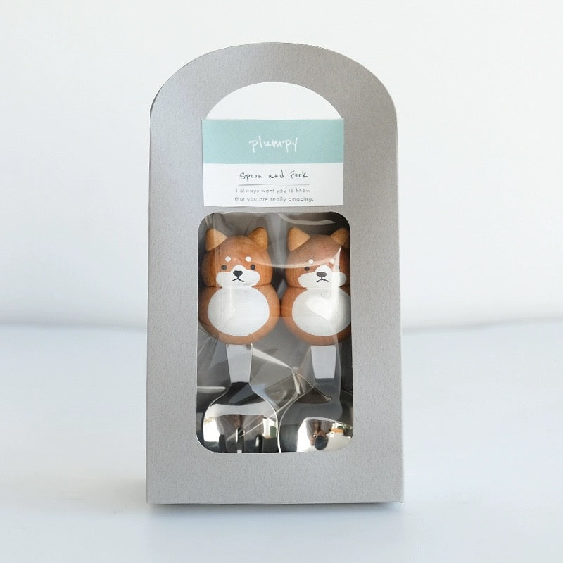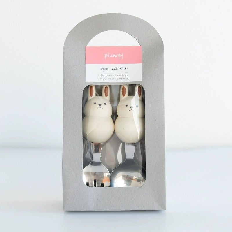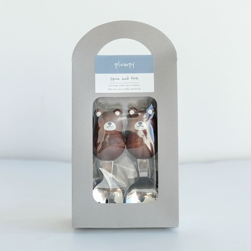 Japan Plumpy Animal Shape Stainless Steel Fork and Spoon Set, Natural Wood Handle, Japanese Cutlery, Multiple Animal Shapes to Choose from