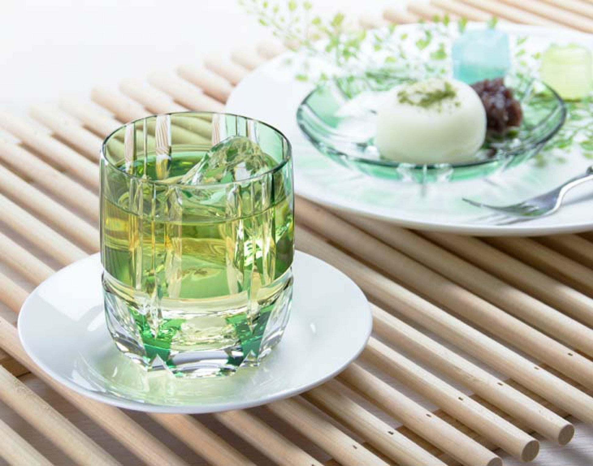 Rock glass with bamboo bowl inspired by fresh green bamboo. The lush, vibrant green color blends with the simple silhouette to create a relaxed moment.